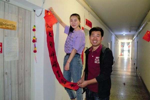 在对联与国旗的装点下,寝室面貌焕然一新。那一面面五星红旗构成了一道靓丽的风景线,节日的喜庆氛围顿时迎面而来。